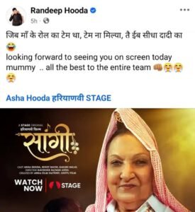 बॉलीवुड एक्टर रणदीप हुड्डा की मां आशा हुड्डा भी अब फिल्मों में नजर आई है। अपनी पहली ही फिल्म में उन्होंने दादी का किरदार निभाया है। एक्टर ने सोशल मीडिया पर पोस्ट कर मां और पूरी टीम को फिल्म के लिए बधाई दी। मजाकिया लहजे में उन्होंने लिखा…जिब मां के रोल का टेम था, टेम ना मिल्या, तै ईब सीधा दादी का। आशा हुड्डा ने  बताया कि करीब डेढ़ साल पहले ये रोल मिला था।