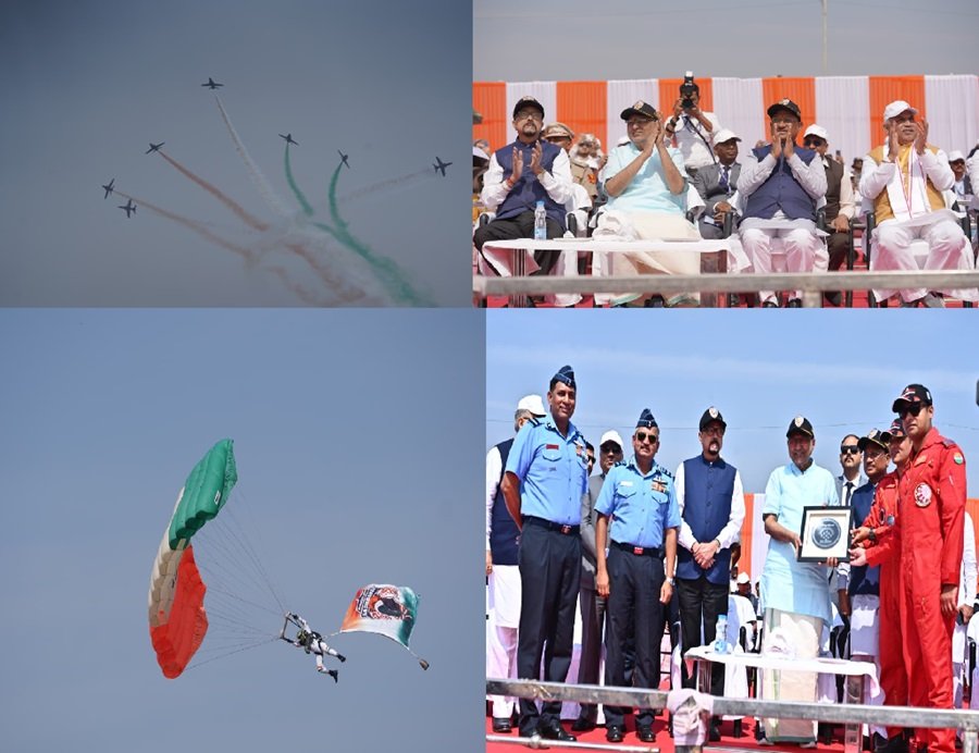 वायु सेना के जाबांज फाइटर पायलटों ने आसमान में दिल की आकृति बनाकर 25वें राज्योत्सव की शुभकामनाएं दीं। उन्होंने तिरंगे के तीन रंगों से डीएनए की आकृति बनाकर तिरंगे के प्रति अपना सम्मान प्रस्तुत किया। उन्होंने 360° में फाइटर जेट उड़ाते हुए उल्टा जेट भी उड़ाया। तेजस और युवाओं को समर्पित अंग्रेजी अक्षर ‘वाई’ की आकृति बनाने के साथ ही कई करतब दिखाए। टीम का प्रदर्शन केवल मनोरंजन नहीं, बल्कि युवाओं में देशप्रेम, साहस और भारतीय सशस्त्र बलों में सेवा की प्रेरणा जगाने का संदेश भी देता है।