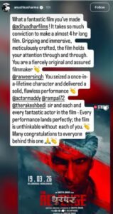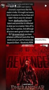 आगे उन्होंने लिखा, ‘आदित्य धर आपका टैलेंट और आपका दृढ़ विश्वास आपके काम में साफ झलकता है। आपको सलाम। आप जीनियस हैं। भले ही सभी एक्टर्स अपने-अपने रोल में बेहतरीन थे, लेकिन रणवीर सिंह, आप इस फिल्म के बाद एक अलग लेवल पर पहुंच गए हैं और आपकी परफॉर्मेंस शानदार से भी कहीं बढ़कर थी। बिल्कुल वॉव।’