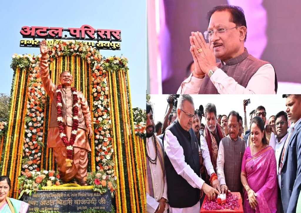 छत्तीसगढ़ में पूर्व प्रधानमंत्री भारत रत्न स्वर्गीय अटल बिहारी वाजपेयी की 101वीं जयंती श्रद्धा और सम्मान के साथ मनाई गई। इस अवसर पर मुख्यमंत्री विष्णु देव साय ने राजधानी रायपुर के अटल एक्सप्रेस-वे में फुंडहर चौक पर स्थापित अटल बिहारी वाजपेयी की भव्य प्रतिमा का अनावरण किया। कार्यक्रम के दौरान पूरा वातावरण देशभक्ति और भावनाओं से सराबोर नजर आया। मुख्यमंत्री विष्णु देव साय ने मूर्ति अनावरण के बाद अटल बिहारी वाजपेयी के योगदान को याद करते हुए कहा कि अटल जी केवल एक राजनेता नहीं, बल्कि भारत की राजनीति में सुशासन, संवेदनशीलता और सर्वसम्मति की मिसाल थे। उन्होंने कहा कि अटल जी का छत्तीसगढ़ से विशेष आत्मीय संबंध रहा है और राज्य के गठन में उनकी ऐतिहासिक भूमिका को कभी भुलाया नहीं जा सकता।
