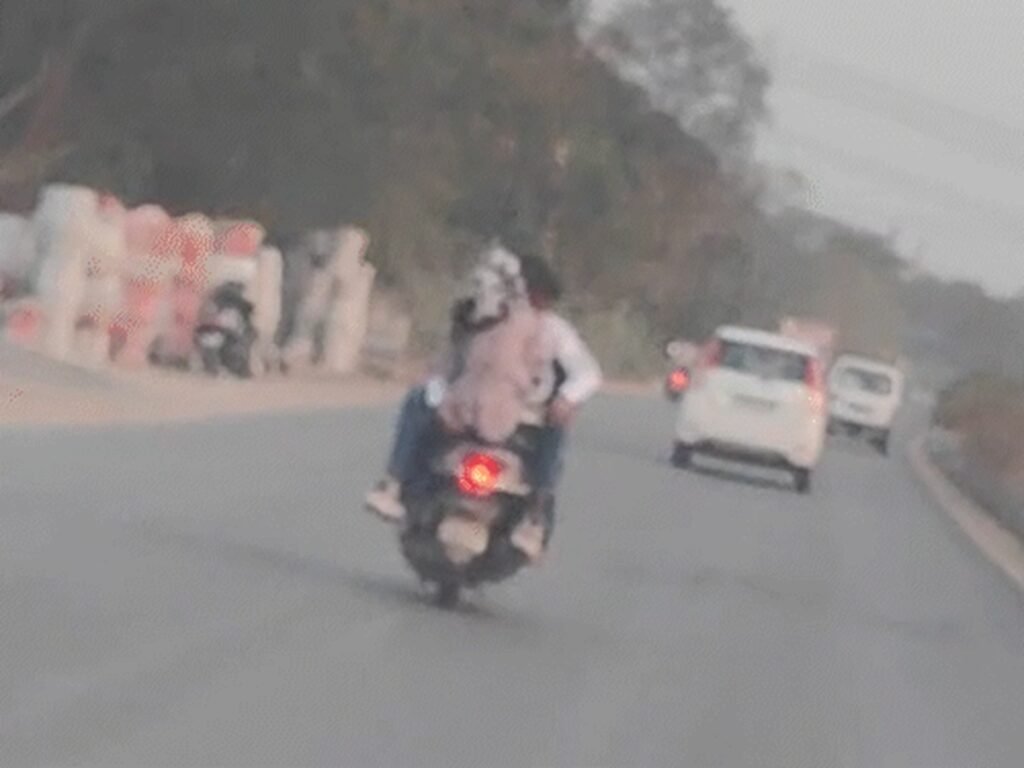 हाईवे पर चलती स्कूटी में गले लगकर बैठे कपल, दूसरा युवक बिना हेलमेट दौड़ाता रहा गाड़ी, ASP बोले- एक्शन होगा