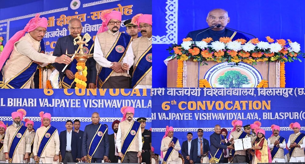 छत्तीसगढ़ : अटल बिहारी वाजपेयी विश्वविद्यालय के छठवें दीक्षांत समारोह का आयोजन पर पूर्व राष्ट्रपति रामनाथ कोविंद के मुख्य आतिथ्य में गरिमामय वातावरण में किया गया। कार्यक्रम की अध्यक्षता राज्यपाल रमेन डेका ने की। अति विशिष्ट अतिथि के तौर पर मुख्यमंत्री विष्णु देव साय, विशिष्ट अतिथि उपमुख्यमंत्री अरुण साव तथा उच्च शिक्षा मंत्री टंकराम वर्मा शामिल हुए। कार्यक्रम में विश्वविद्यालय के कुलपति आचार्य डॉ. दिवाकर नाथ वाजपेयी उपस्थित रहे। समारोह में 64 शोद्यार्थियों को शोध उपाधि, 92 गोल्ड मेडल एवं 36950 स्नातक एवं स्नातकोत्तर उपाधि दी गई। विश्वविद्यालय के दीक्षांत समारोह में मुख्य अतिथि पूर्व राष्ट्रपति रामनाथ कोविंद ने स्नातक छात्रों को उनके उज्ज्वल भविष्य के लिए हार्दिक शुभकामनाएँ दीं और राष्ट्र निर्माण में सक्रिय योगदान देने का आह्वान किया। उन्होंने युवा पीढ़ी की ऊर्जा और आत्मविश्वास की सराहना करते हुए कहा कि भारत आज दुनिया की तेजी से बढ़ती अर्थव्यवस्थाओं में अग्रणी है और वर्तमान युवा इसका ऐतिहासिक साक्षी और भागीदार हैं। उन्होंने कहा कि विश्वविद्यालय से स्नातक होना शिक्षा की पूर्णता नहीं है, बल्कि इक्कीसवीं सदी में सफलता के लिए निरंतर सीखना, कौशल निखारना और आत्मविकास अनिवार्य है।