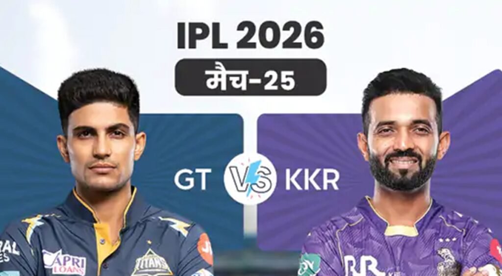 IPL 2026 का 25वां मुकाबला आज गुजरात टाइटंस और कोलकाता नाइट राइडर्स के बीच खेला जाएगा। मैच गुजरात के होम ग्राउंड अहमदाबाद के नरेंद्र मोदी स्टेडियम में शाम 7:30 बजे से शुरू होगा। मुकाबले का टॉस शाम 7:00 बजे होगा। KKR ने इस सीजन 5 मुकाबले खेले हैं। उसे 4 मैच में हार मिली है और एक मुकाबला बारिश के कारण रद्द रहा है। GT ने 4 मैच खेले हैं और उसे 2 मैच में जीत और इतने ही मैच में हार मिली है। टीम ने पिछले दो मैचों में दिल्ली और लखनऊ को हराया।