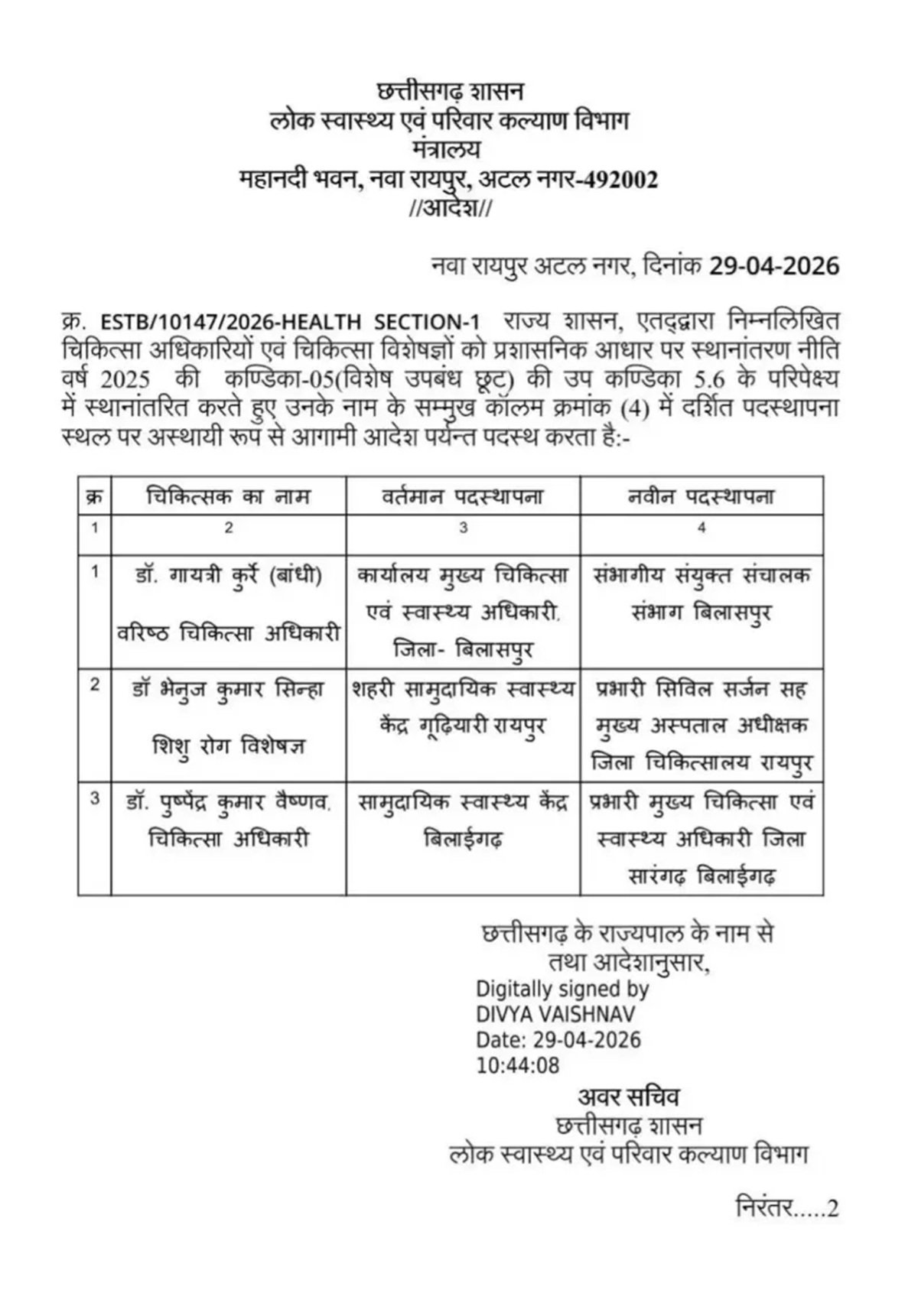 CG : स्वास्थ्य विभाग में बड़ा फेरबदल, 3 डॉक्टरों के तबादले, जानें किसे मिली कौन-सी जिम्मेदारी