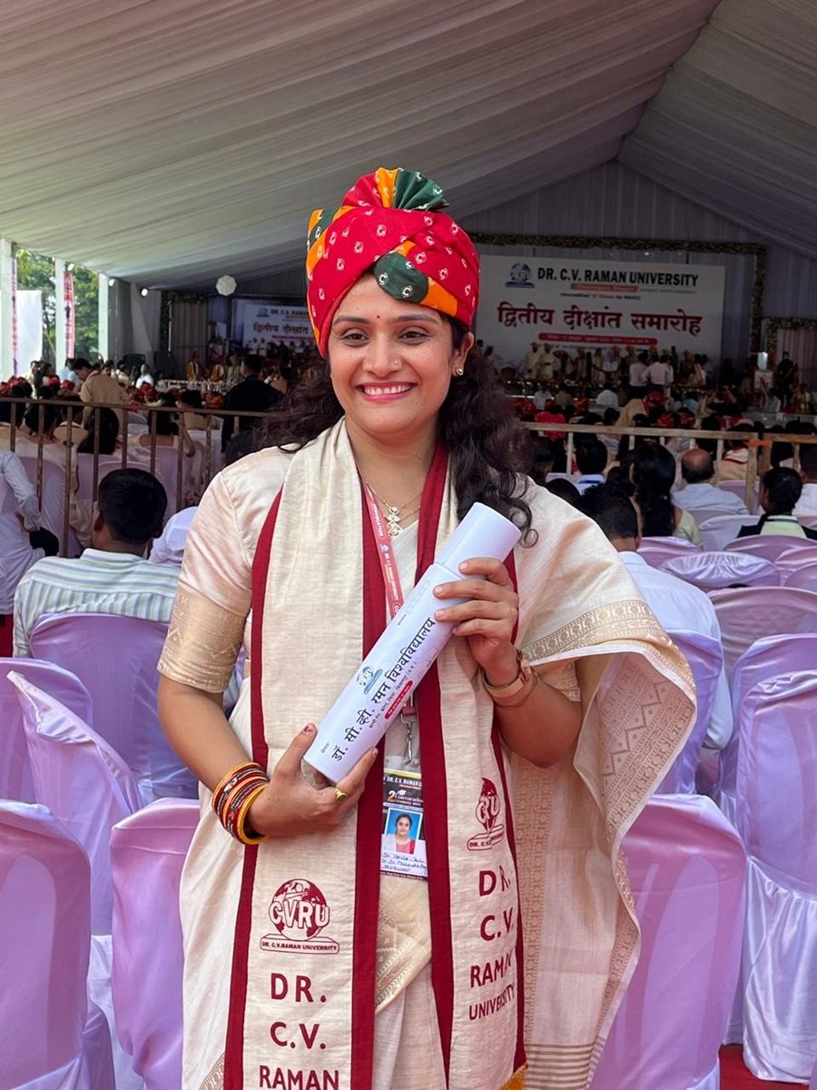डॉ. सी.वी. रमन विश्वविद्यालय, कोटा (बिलासपुर) के दीक्षांत समारोह में माननीय राज्यपाल महोदय के करकमलों से डॉ. वर्षा जोशी को डॉक्टरेट की उपाधि प्रदान की जाएगी। डॉ. वर्षा अभिषेक जोशी ने यह सिद्ध किया है कि एक गृहिणी भी दाम्पत्य जीवन की जिम्मेदारियों का निर्वहन करते हुए शिक्षा और अनुसंधान के क्षेत्र में उल्लेखनीय उपलब्धि हासिल कर सकती है। उन्होंने दोनों कुलों – मायका और ससुराल – सहित पूरे समाज का नाम ऊँचा किया है।