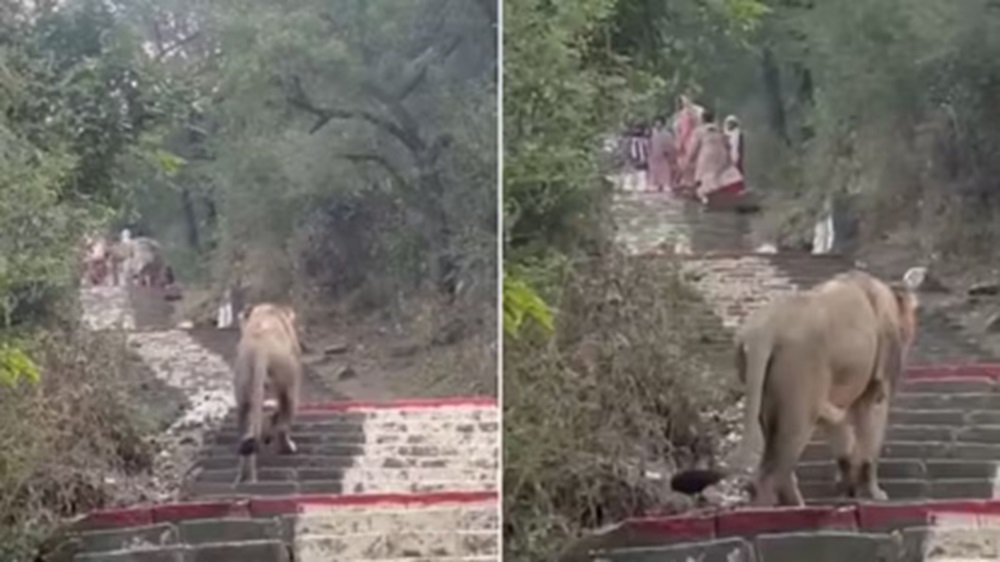 जंगल से निकल मंदिर की सीढ़ियों पर पहुंच गया शेर, डरकर भागने लगे श्रद्धालु…Video