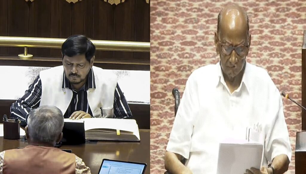 केंद्रीय मंत्री रामदास अठावले और राष्ट्रवादी कांग्रेस पार्टी (SP) प्रमुख शरद पवार समेत 19 नए और दोबारा चुने गए राज्यसभा सदस्यों ने सोमवार को शपथ ली। शरद पवार व्हीलचेयर पर शपथ लेने के लिए संसद पहुंचे। शपथ लेने वालों में 5 महाराष्ट्र, 3 ओडिशा, 6 तमिलनाडु और 5 पश्चिम बंगाल के सदस्य है। राज्यसभा के सभापति सी.पी. राधाकृष्णन की मौजूदगी में सभी सदस्यों को शपथ दिलाई गई। 16 अप्रैल से तीन दिन का विशेष सत्र बुलाया गया है। 10 राज्यों की 37 राज्यसभा सीटें 2 अप्रैल को खाली हुई थीं। इन सीटों के 26 उम्मीदवार निर्विरोध चुने गए थे, जबकि बाकी 11 सीटों पर 16 मार्च को वोटिंग हुई।