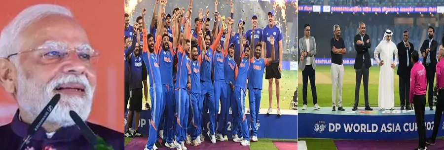 दुबई में रविवार को एशिया कप के फाइनल में भारत ने पाकिस्तान को 5 विकेट से हरा कर नौवीं बार एशिया कप का खिताब जीत लिया है। भारत की जीत के बाद प्रधानमंत्री मोदी ने सोशल मीडिया पर लिखा- ऑपरेशन सिंदूर खेल के मैदान पर जारी। पाकिस्तान क्रिकेट बोर्ड (PCB) के चेयरमैन मोहसिन नकवी विजेता टीम को अवॉर्ड देने पहुंचे, लेकिन भारतीय टीम ने उनसे अवॉर्ड लेने से इनकार कर दिया। अवॉर्ड सेरेमनी के प्रेजेंटर साइमन डूल ने बताया कि भारतीय टीम अवॉर्ड्स नहीं लेगी। इस बीच मंच पर मौजूद दुबई स्पोर्ट्स सिटी के खालिद अल जरूनी से ट्रॉफी लेने की बात हुई, लेकिन नकवी मंच से हटने को तैयार नहीं हुए। इसके बाद कार्यक्रम खत्म कर दिया गया और नकवी मंच से उतरे। वे ट्रॉफी और मेडल्स भी अपने साथ ले गए। नकवी पाकिस्तान के गृहमंत्री हैं, पाकिस्तान क्रिकेट बोर्ड (PCB) और एशियन क्रिकेट काउंसिल (ACC) के अध्यक्ष भी हैं। भारत ने ऐसा 22 अप्रैल के पहलगाम आतंकी हमले के विरोध में किया। टीम इंडिया ने पूरे टूर्नामेंट के दौरान पाकिस्तानी खिलाड़ियों से हाथ भी नहीं मिलाया था।