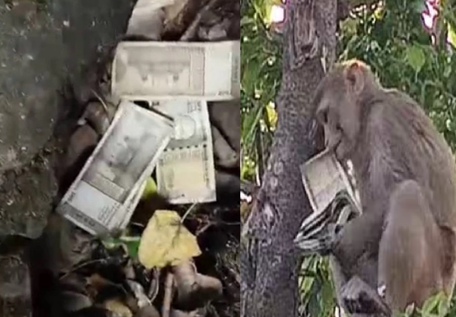 प्रयागराज में बंदर ने लुटाए 500-500 के नोट.. Video डिग्गी से बैग निकालकर पेड़ पर चढ़ा…
