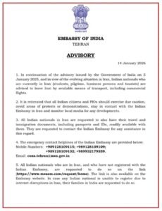 ईरान में हिंसक प्रदर्शन की वजह से भारत सरकार ने बुधवार को नागरिकों के लिए एडवाइजरी जारी की है। इसमें कहा गया है कि जो भी भारतीय नागरिक, चाहे वे छात्र हों, तीर्थयात्री हों, व्यापारी हों या पर्यटक, इस समय ईरान में हैं, उन्हें जल्द से जल्द वहां से निकल जाना चाहिए। इस एडवाइजरी में कहा गया है कि यह सलाह 5 जनवरी की पिछली एडवाइजरी के आगे की कड़ी है और ईरान की बदलती परिस्थितियों को देखते हुए दी गई है। सरकार ने यह भी दोहराया है कि सभी भारतीय नागरिकों को सावधानी बरतनी चाहिए। उन्हें विरोध प्रदर्शन या भीड़भाड़ वाली जगहों से दूर रहना चाहिए। ईरान में मौजूद भारतीय नागरिक भारतीय दूतावास के संपर्क में रहें और स्थानीय मीडिया पर नजर रखें ताकि किसी भी नई जानकारी से अवगत रहें। वहीं, विदेश मंत्री एस. जयशंकर को बुधवार देर शाम ईरान के विदेश मंत्री अब्बास अराघची से फोन पर ईरान से जुड़े हालातों पर बात की।